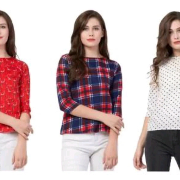 Fabric: Crepe Sleeve Length: Three-Quarter Sleeves Pattern: Printed Multipack: 3 Sizes: S (Bust Size: 36 in, Length Size: 23 in) M (Bust Size: 38 in, Length Size: 24 in) L (Bust Size: 40 in, Length Size: 24 in) XL (Bust Size: 42 in, Length Size: 25 in) XXL (Bust Size: 44 in, Length Size: 26 in) Dispatch: 2-3 Days
