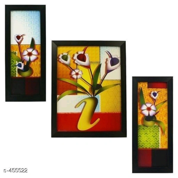Material: Wood and Plastic Dimension(LxW): Frame 1 - 12.5 in X 5.2 in, Frame 2 - 12.5 in X 9.5 in, Frame 3 - 12.5 in X 5.2 in Description: It Has 3 Pieces Of Frames With Paintings (Glass Is Not Included) Work: Printed Dispatch: 1 Day