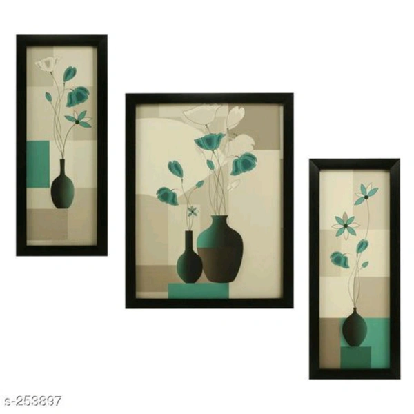 Material: Wood & Plastic Size: Frame 1 (L x W) - 12.5 in x 5.2 in, Frame 2 (L x W) - 9.5 in x 12.5 in, Frame 3 (L x W) - 12.5 in x 5.2 in Description: It Has 3 Pieces Of Frames With Painting (Glass Is Not Included) Work: Printed Dispatch: 1 Day